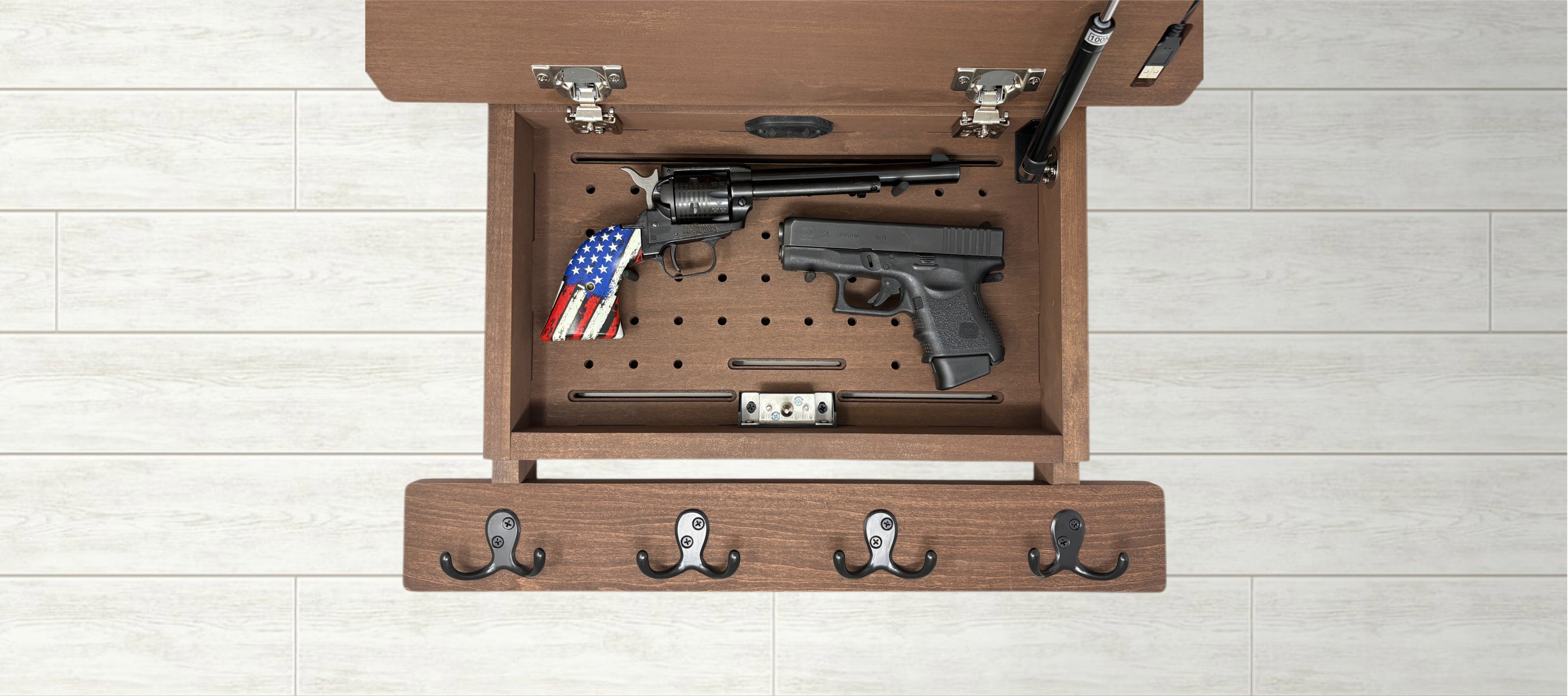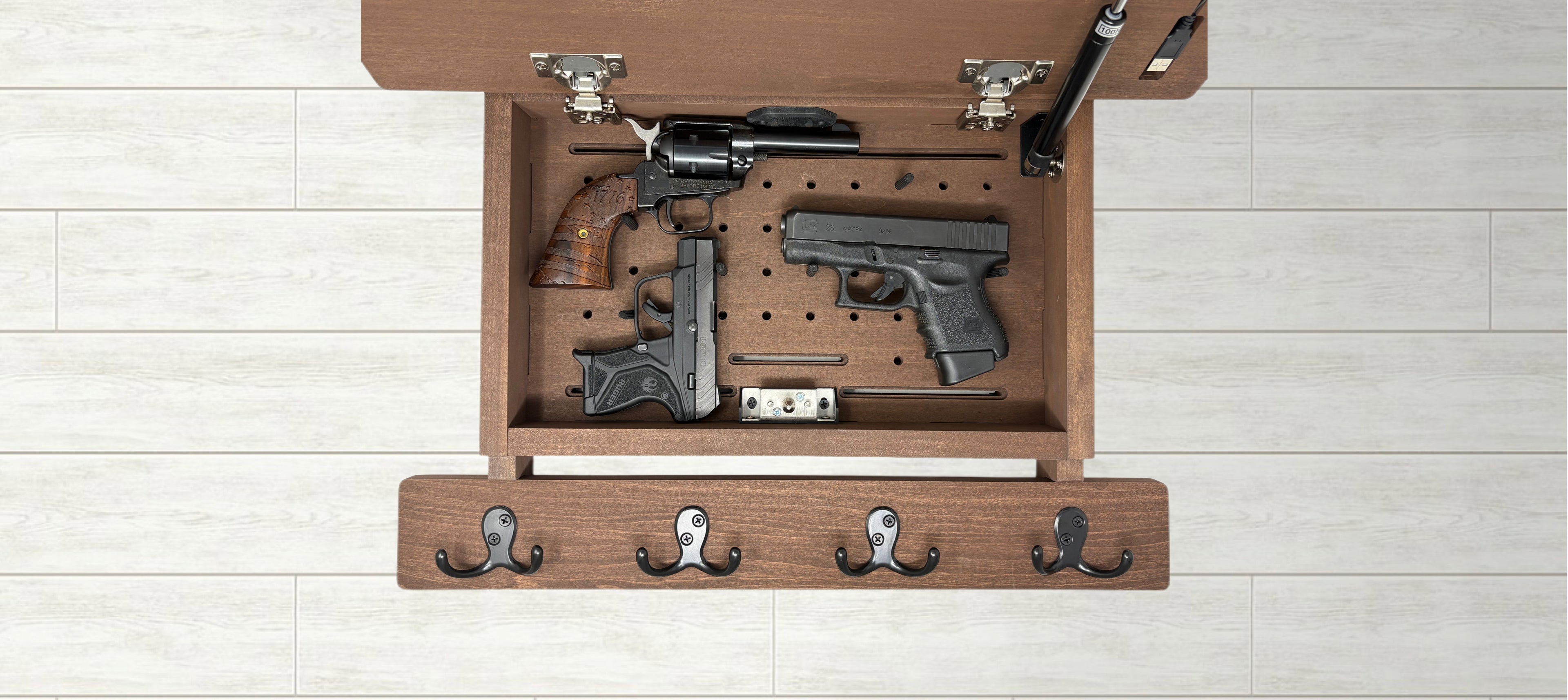 This handcrafted piece doubles as functional home decor — designed to discreetly store firearms while offering hooks for coats, bags, or keys. With its secure, hidden compartment and clean aesthetic, it blends safety, organization, and style into one smart solution.