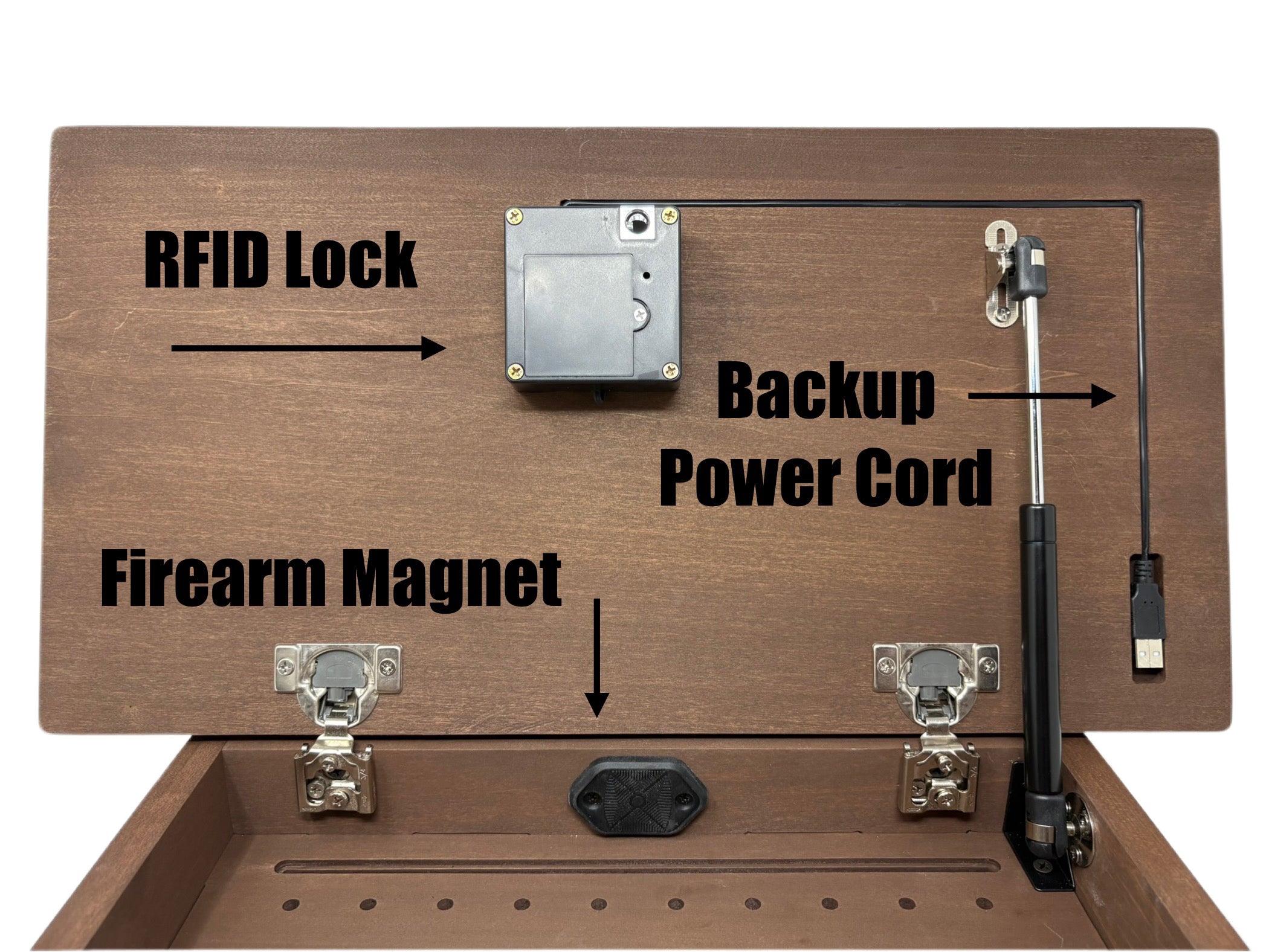 Our RFID lock is dual powered, primarily running on batteries with a discreet backup cord option. The cord is hidden outside the box to ensure you can still access the lock if the batteries ever die.