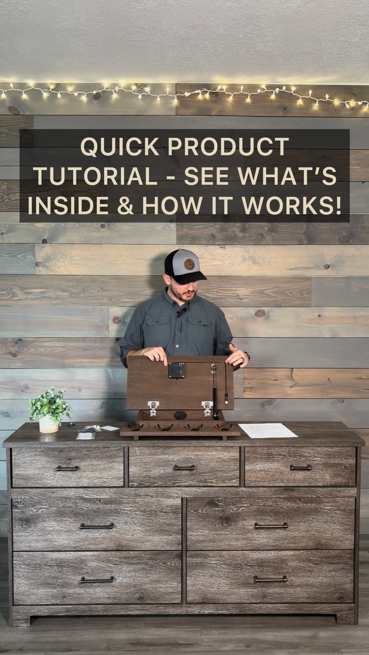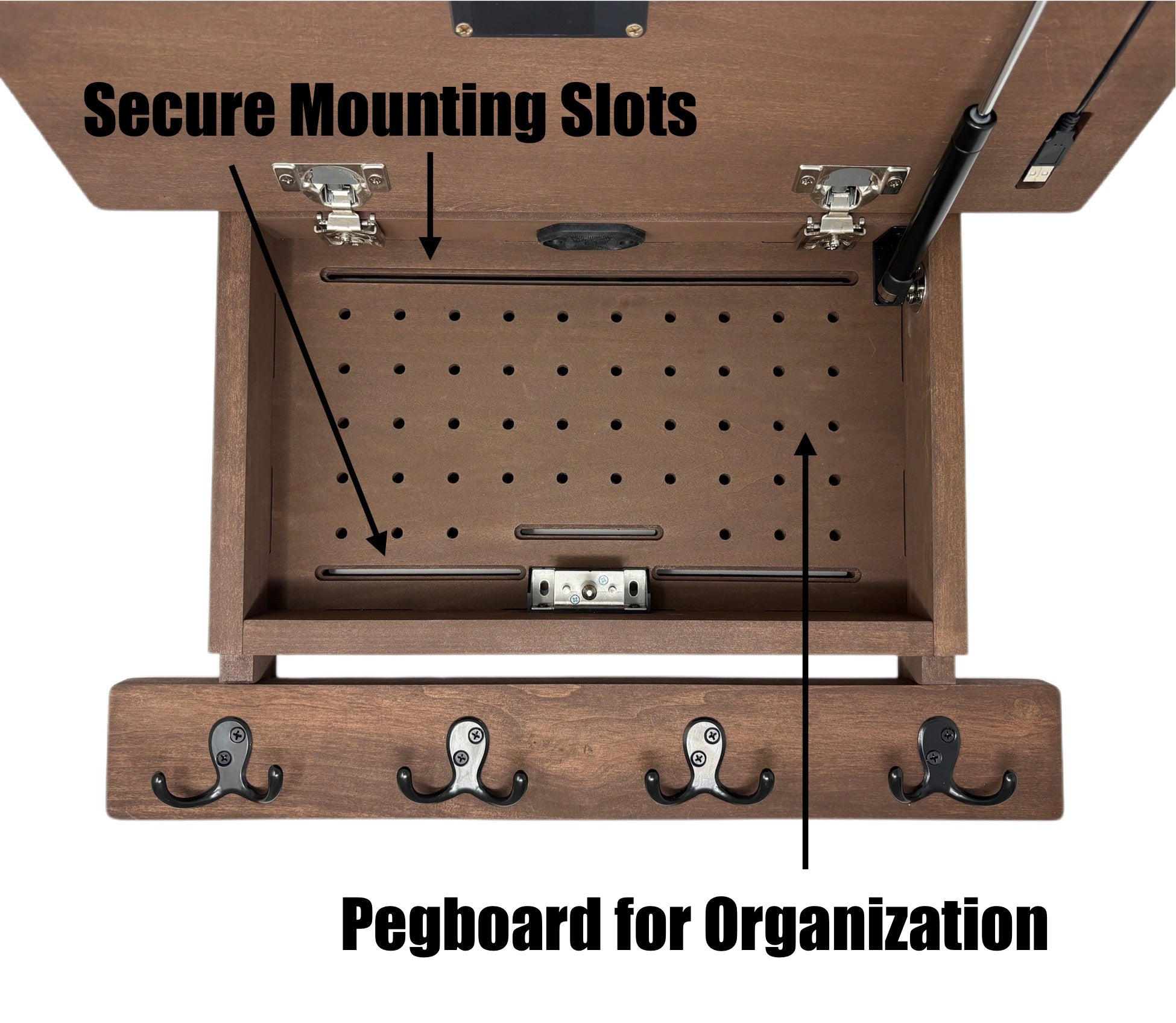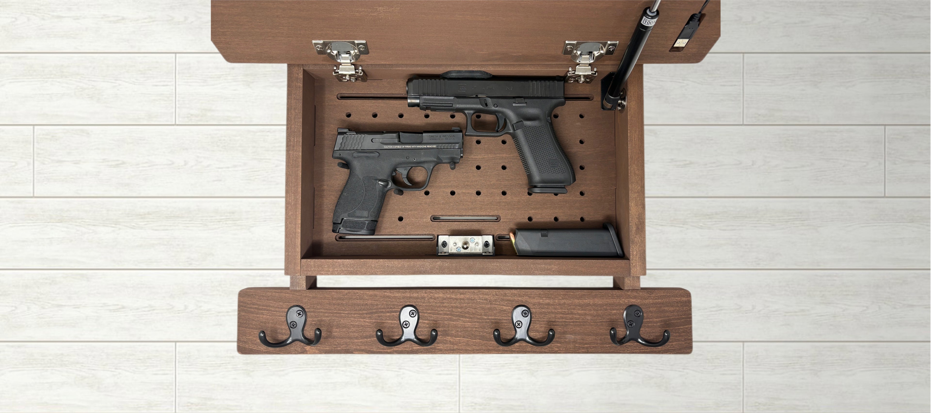 This handcrafted piece doubles as functional home decor — designed to discreetly store firearms while offering hooks for coats, bags, or keys. With its secure, hidden compartment and clean aesthetic, it blends safety, organization, and style into one smart solution.